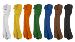 Il colore della cintura rappresenta i diversi livelli di esperienza: si comincia con le cinture colorate (Kyu), bianca, gialla, arancio, verde, blu e marrone conquistando così in circa cinque anni di pratica la cintura nera e la possibilità di accedere ai successivi gradi (Dan). Normalmente, per passare al Dan successivo sono richiesti tanti anni di permanenza nel Dan precedente quanto è il grado da conquistare: così per passare dal primo al secondo Dan ci vogliono due anni, al terzo altri tre, al quarto altri quattro e così via.